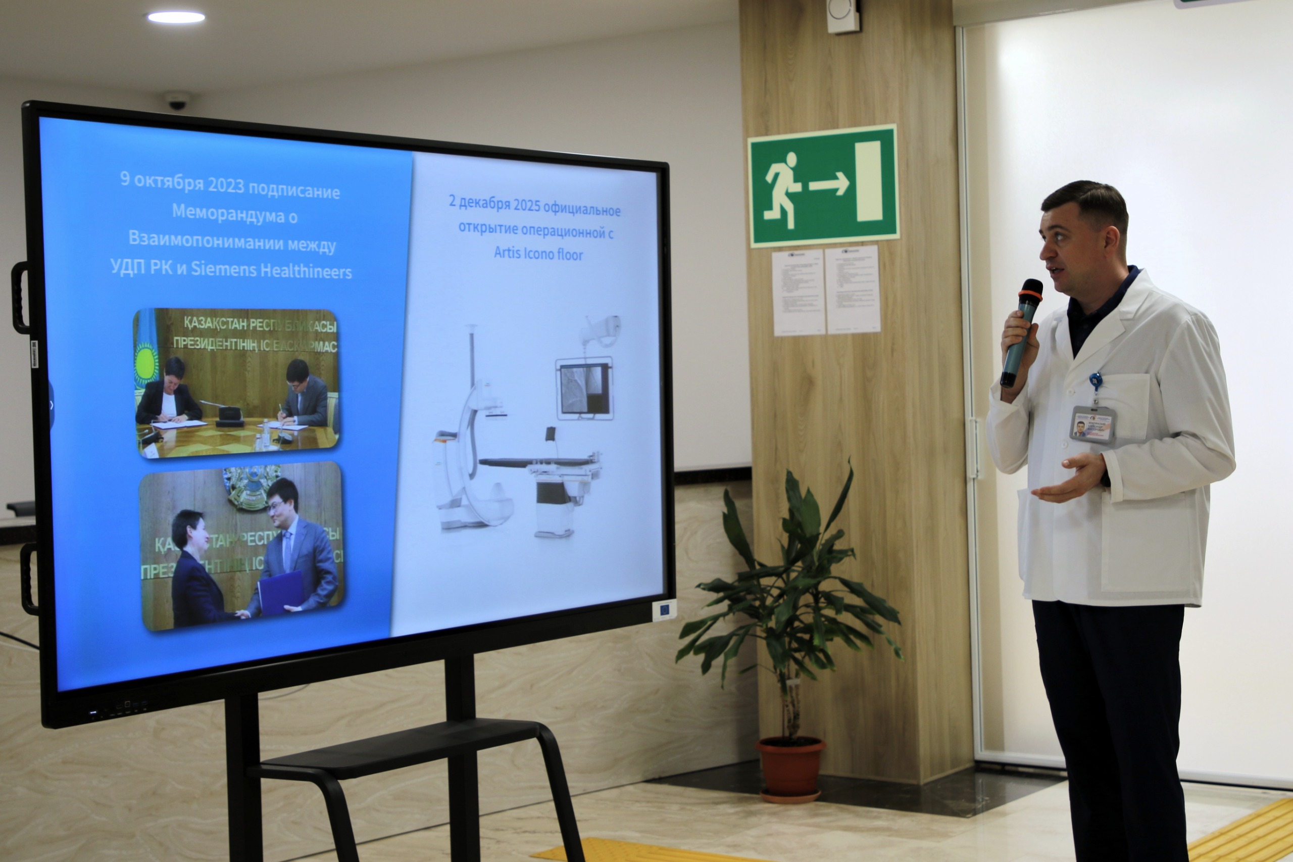 Іс-шара барысында референс-орталықтың жұмысы таныстырылды. Рентгенхирургия бөлімінің меңгерушісі Александр Землянский Artis Icono floor жүйесінің негізгі мүмкіндіктерін көрсетті. Оның айтуынша, бұл кешен кардиоинтервенциялар, нейроинтервенциялық процедуралар және қантамырлық араласуларға арналған бағдарламалық пакеттермен жабдықталған. Мұндай мүмкіндіктер түрлі аз инвазиялы операцияларды бірыңғай технологиялық ортада жүргізуге жағдай жасайды.