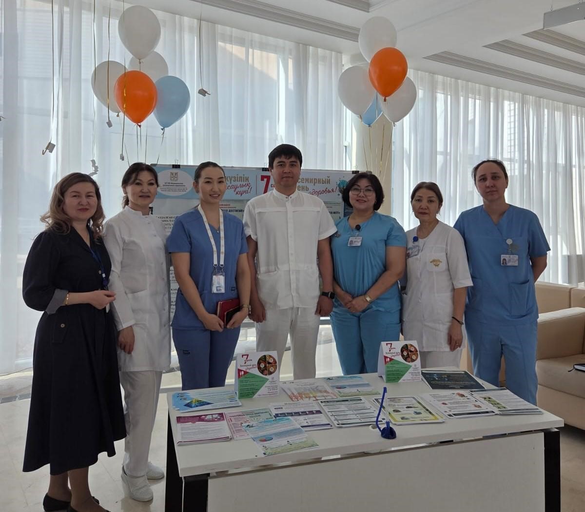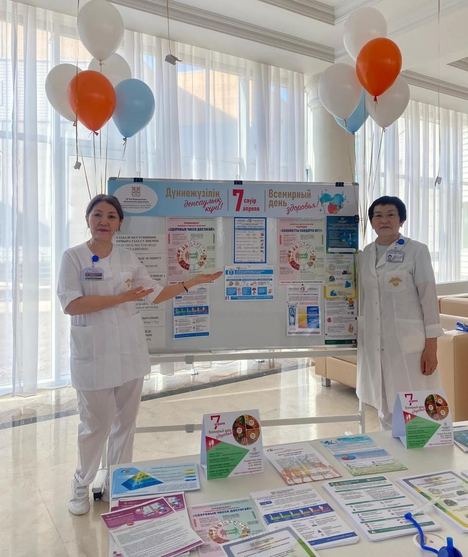 - Аурухананың орталық галереясында қызметкерлер мен келушілердің қатысуымен жалпы жаттығу жасалды. Акцияның әрбір қатысушысына дұрыс тамақтану, физикалық белсенділік және аурулардың алдын алу бойынша үлестірме материалдар (жадынамалар, буклеттер, брошюралар) берілді.