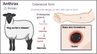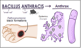 Causative organism: spore-forming bacteria (Bacillus anthracis). Spores, formed in outside environment, in vitro, are highly resistant to physical and chemical exposure, and produce virulent poison – exotoxin after entering human or animal body.
