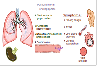 - Pulmonary (rare) – fever, chest pain, breathlessness, blood pressure drop, cardiac acceleration, bloody cough (scabs in lymph nodes).