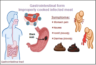 - Alimentary (eating raw / insufficiently thermally treated meat of infected animal).