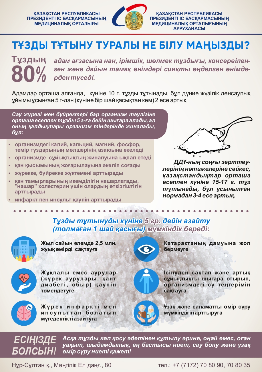 - Біздің тұрғындардың көпшілігі орташа есеппен күніне 15-17 грамм тұз тұтынады, бұл ДДҰ сарапшылары ұсынған деңгейден 3-4 есе асады.