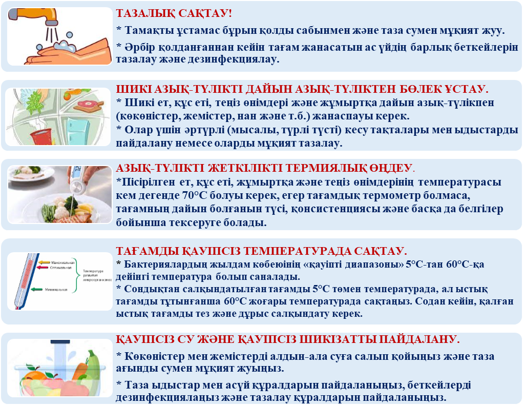 ЕСІҢІЗДЕ БОЛСЫН! Тағамдық аурулардың көпшілігін тағамды дұрыс өңдеу бойынша ұсынылған қарапайым қадамдарды орындау арқылы болдырмауға болады.