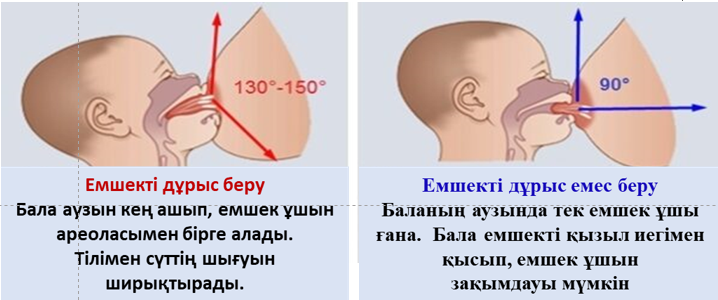 ДҰРЫС ЕМІЗУДІҢ БАСТЫ ҚАҒИДАСЫ – ЕМШЕКТІ ДҰРЫС БЕРУ – емшек ұшы баланың таңдайына тигенде, немесе емшек ұшы баланың аузына тура емес, сәл жоғары қарап тұрғанда дұрыс емізу болып саналады. Бұл жағдайда сүтбез ареоласының төменгі жағы көбірек баланың ауызына кіріп тұрады. Баланың аузын неғұрлым кең аштырған жөн (бұрыш 130-150 гр.), тілі қызыл иектің үстінде болуы керек, сонда ему кезінде анасы ауырсынуды сезіебейді.