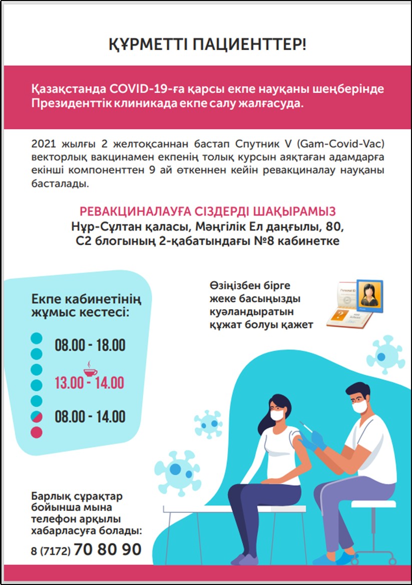 НАЗАР АУДАРЫҢЫЗ! ҚР ПІБ МО ауруханасында 2021 жылғы 2 желтоқсаннан бастап Спутник V (Гам-Ковид-Вак) векторлық вакцинамен екпенің толық курсын аяқтаған адамдарға екінші компонент алғаннан 9 ай өткеннен кейін ревакцинация науқаны басталады.