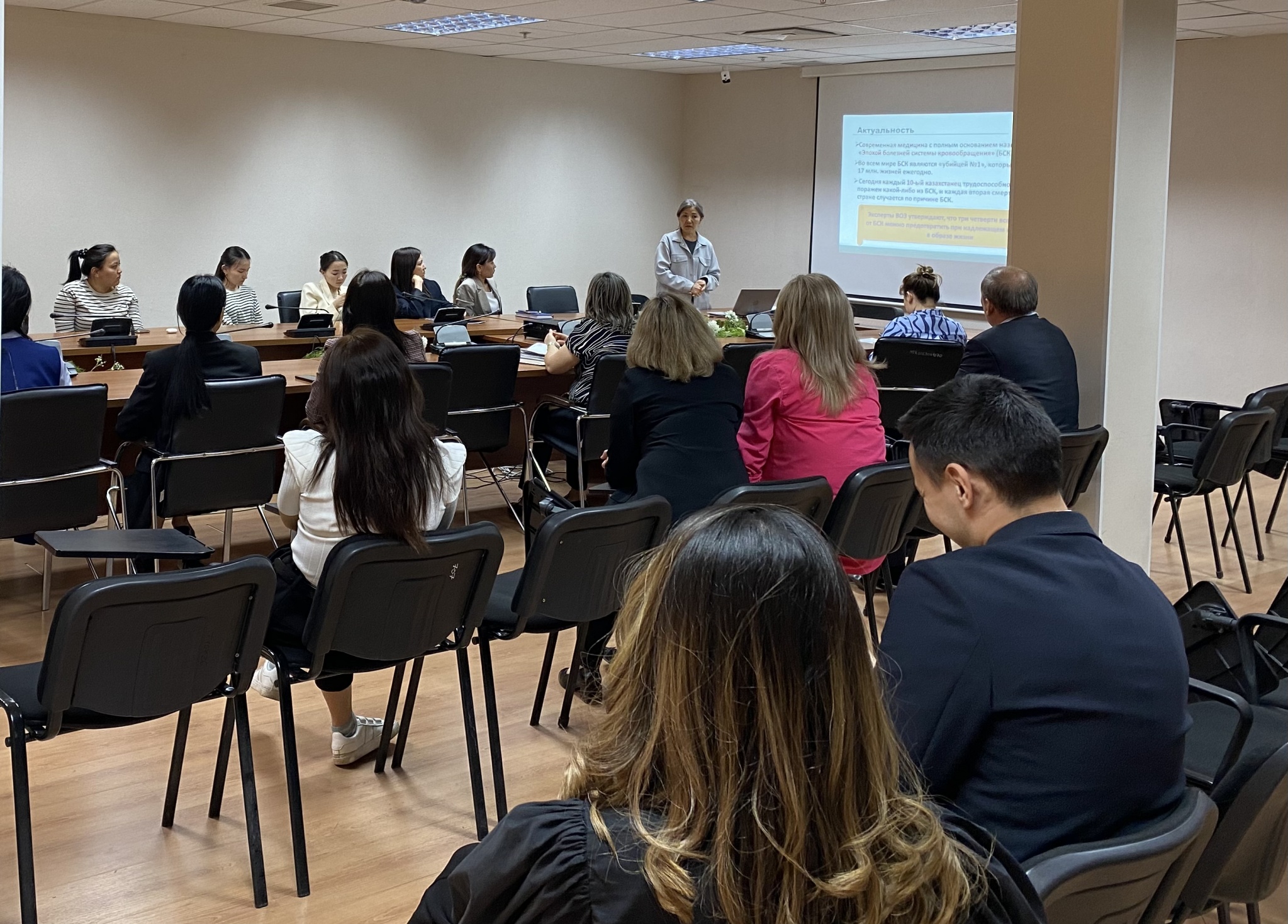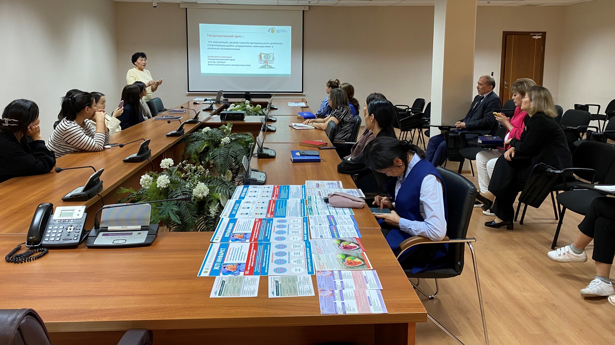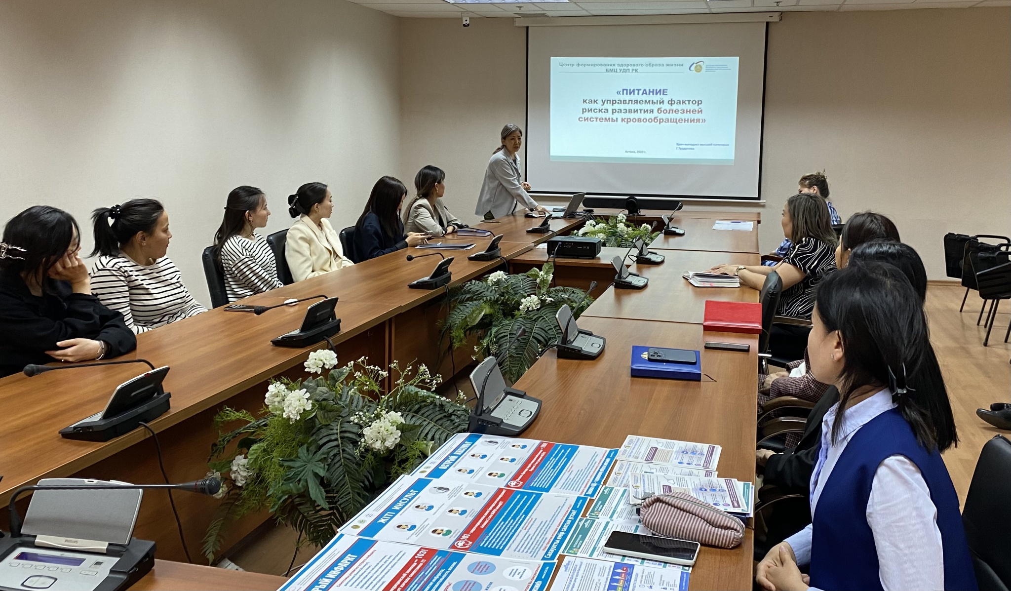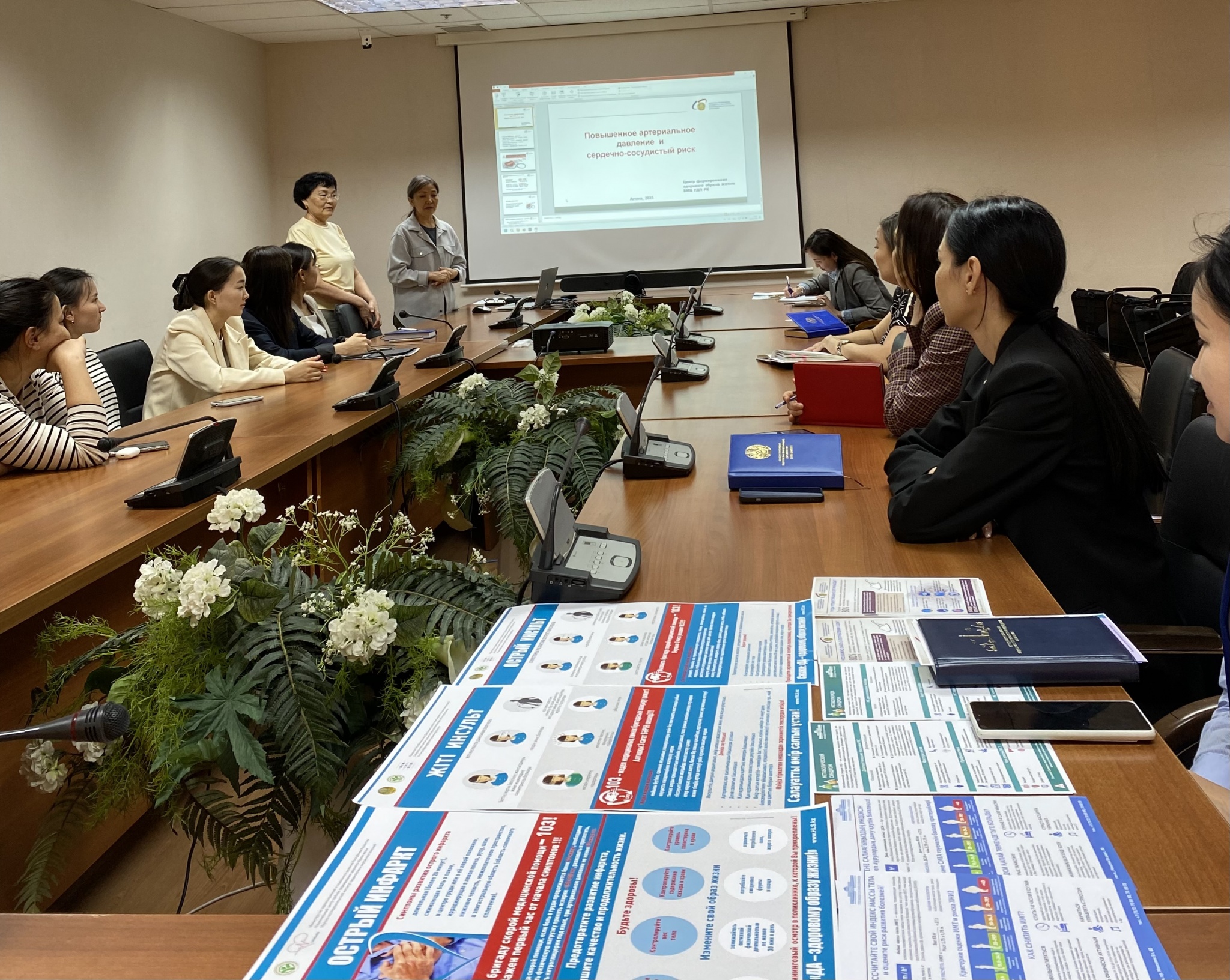 СӨСҚО әдіскер-дәрігерлері Г. Сақанова, Г. Тұрдұнова қатысқандардың назарына «Жоғары қан қысымы және жүрек-қан тамырлары ауруларының қаупі. Алдын алу шаралары», «Тамақтану – жүрек-қантамыр аурулары (ЖҚА) үшін басқарылатын тәуекел факторы ретінде» тақырыптары бойынша презентациялар ұсынылды.