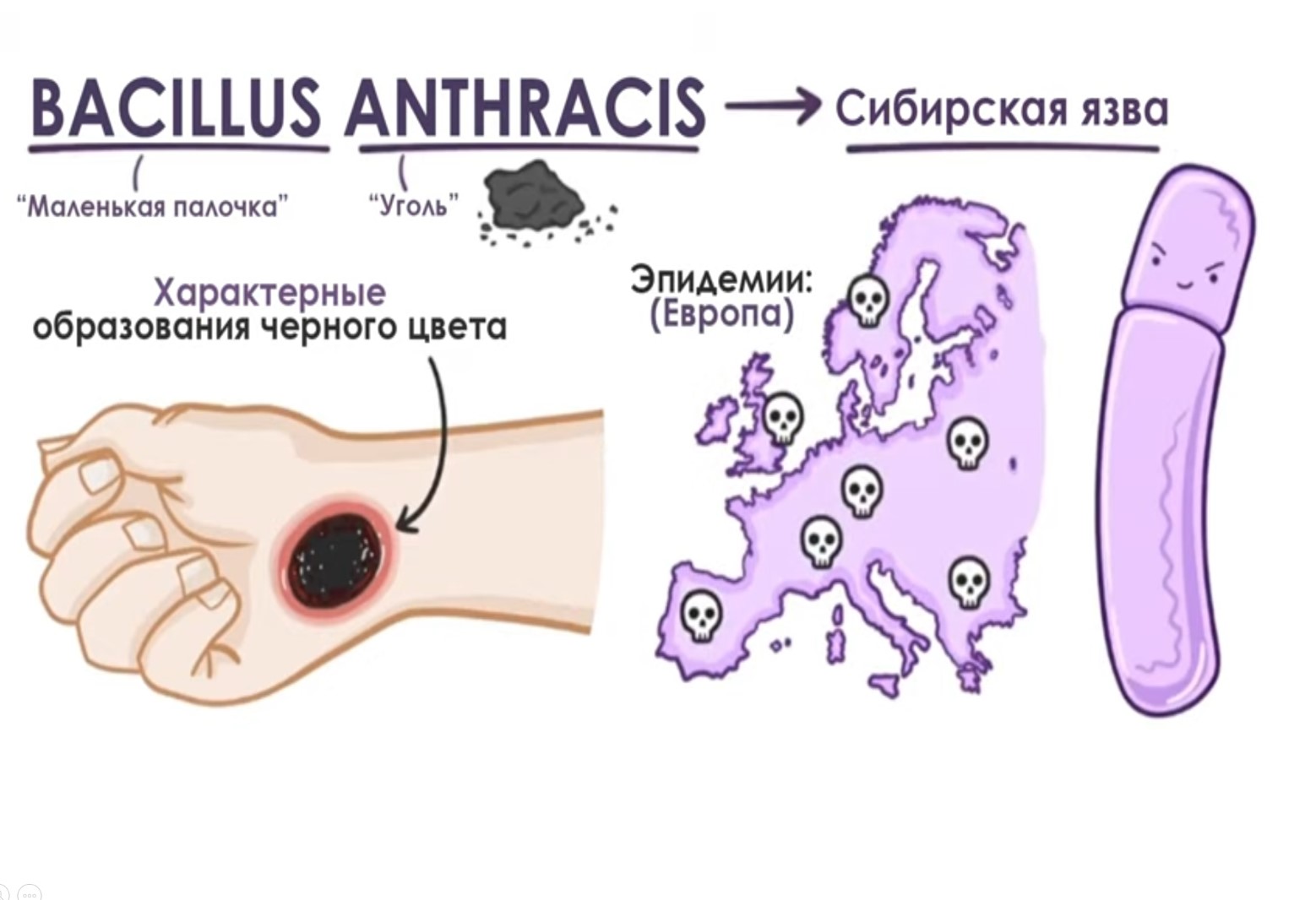 Возбудитель: спорообразующая бактерия (Bacillus anthracis). Споры образуются во внешней среде вне живого организма, высоко устойчивые к физико - химическим воздействиям, попадая в организм животного или человека выделяют сильнодействующий яд - экзотоксин.