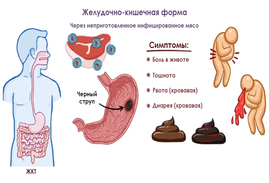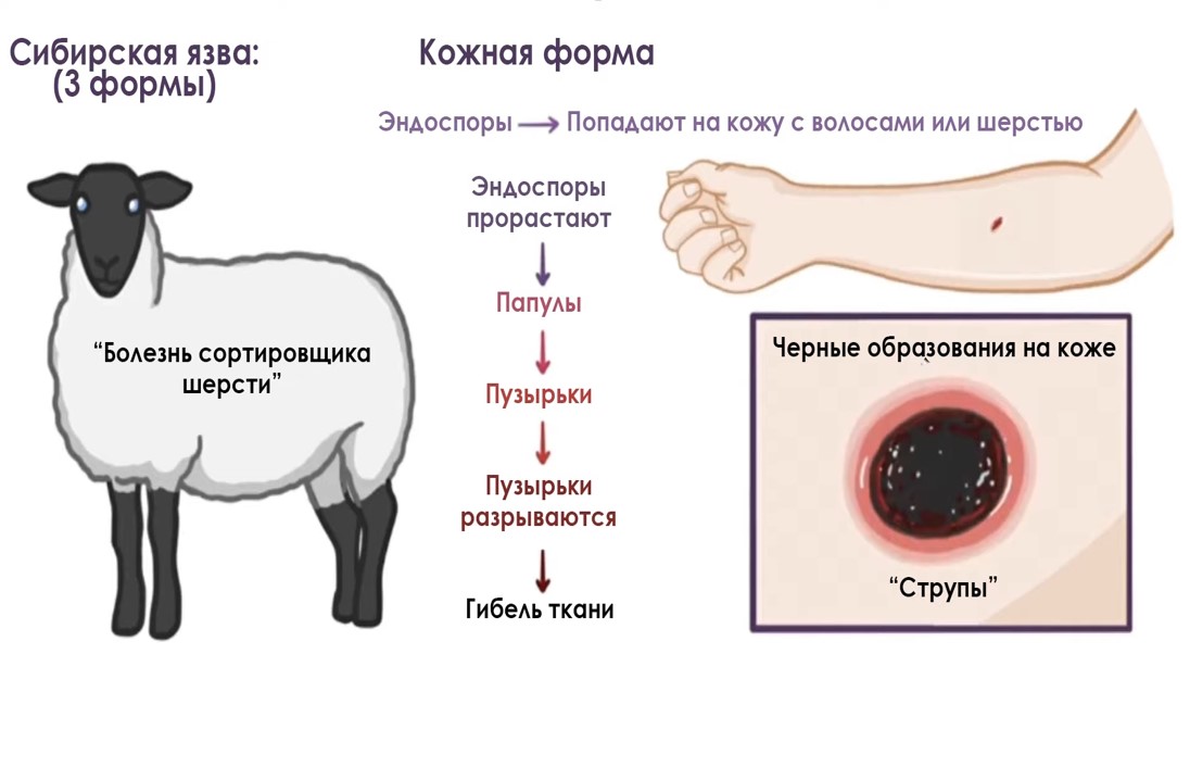 - Контактный (через поврежденную кожу при уходе за больным животным, забое скота, обработке шкур, шерсти, меха, обсемененных спорами возбудителя);