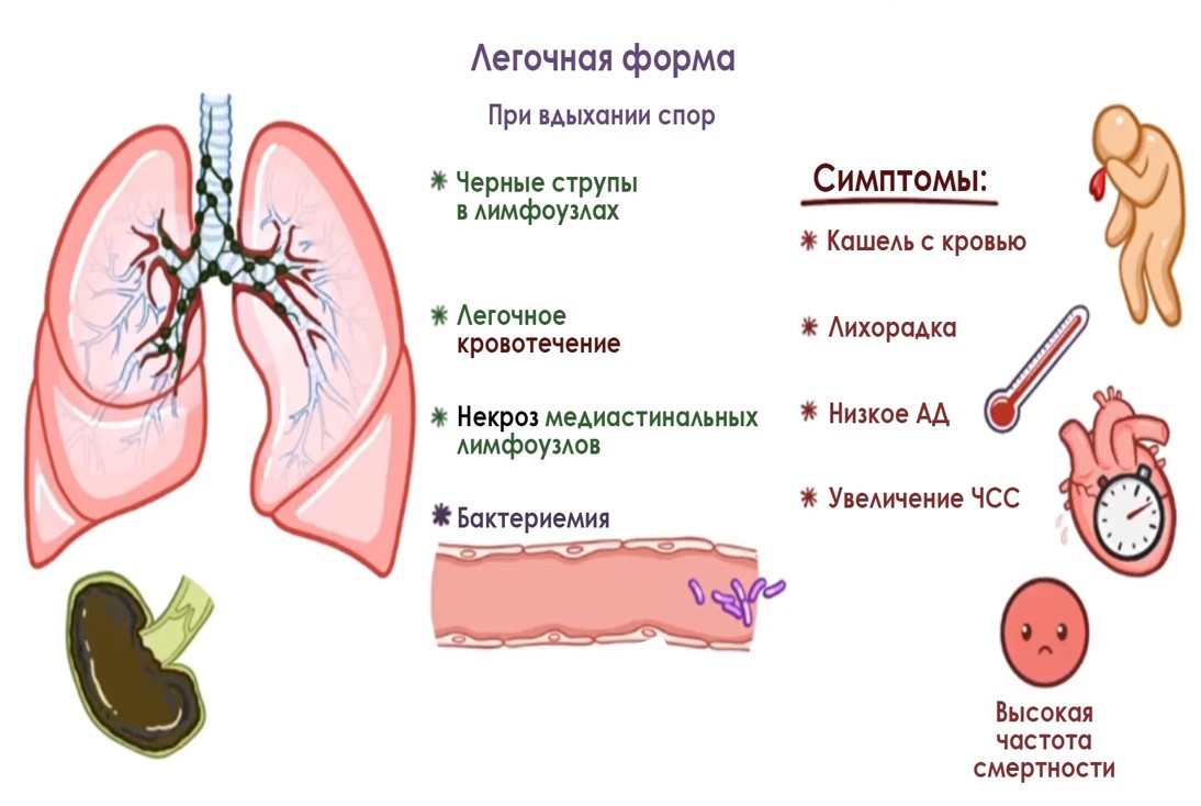 - Легочная (встречается редко) – лихорадка, боли в груди, одышка, снижение АД, учащение пульса, кашель с кровью (струпы в лимфатических узлах).